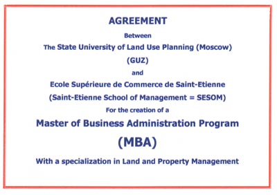 The title page of the agreement between the Moscow State University of Land Management and Saint-Etienne School of Management (France) for the creation of a "Master of Business Administration" Program".